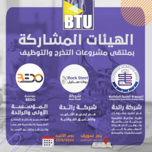 القائمة الأولى للشركات والمصانع والهيئات المشاركة في ملتقى مشروعات التخرج والتوظيف القائمة الأولى للشركات والمصانع والهيئات المشاركة في ملتقى مشروعات التخرج والتوظيف يوم الأثنين الموافق 23/ 6/ 2025 الساعة العاشرة صباحًا العنوان/ مقر جامعة بني سويف التكنولوجية – شرق النيل – الحي الأول – شارع النرجس _______________________ المركز الإعلامي الموقع الالكتروني لجامعة بني سويف التكنولوجية: https://btu.edu.eg Editor2025-06-14T12:15:54+02:00