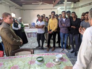 كان في استقبال الطلاب القائمين على إدارة المصنع وقام أحد الكيميائيين بشرح مراحل تصنيع البورسلين بدءًا من استخدام المواد وفصلها ثم دمجها وعملية الإنتاج والتنظيف.