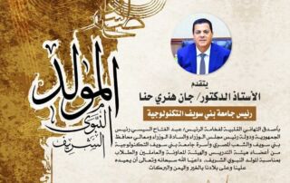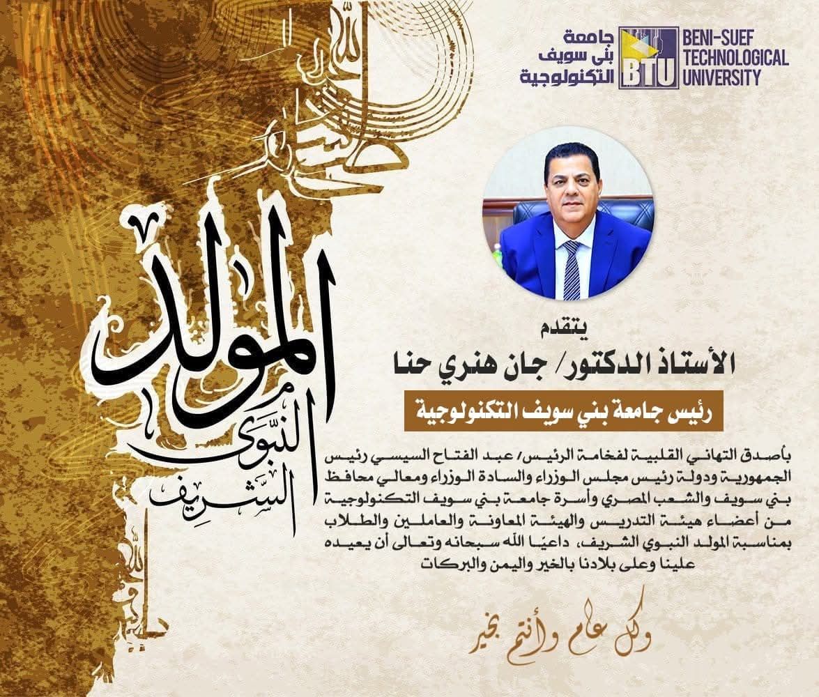 يتقدم الأستاذ الدكتور/ جان هنري حنا رئيس جامعة بني سويف التكنولوجية بخالص التهاني القلبية لفخامة الرئيس/ عبدالفتاح السيسي رئيس الجمهورية ودولة رئيس مجلس الوزراء والسادة الوزراء ومعالي محافظ بني سويف وأسرة جامعة بني سويف التكنولوجية من أعضاء هيئة التدريس والهيئة المعاونة والعاملين والطلاب وأهالي محافظة بني سويف والشعب المصري بمناسبة ذكرى المولد النبوى الشريف داعيًا الله سبحانه وتعالى أن يعيده علينا بالخير واليمن والبركات وكل عام وأنتم بخير