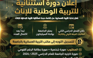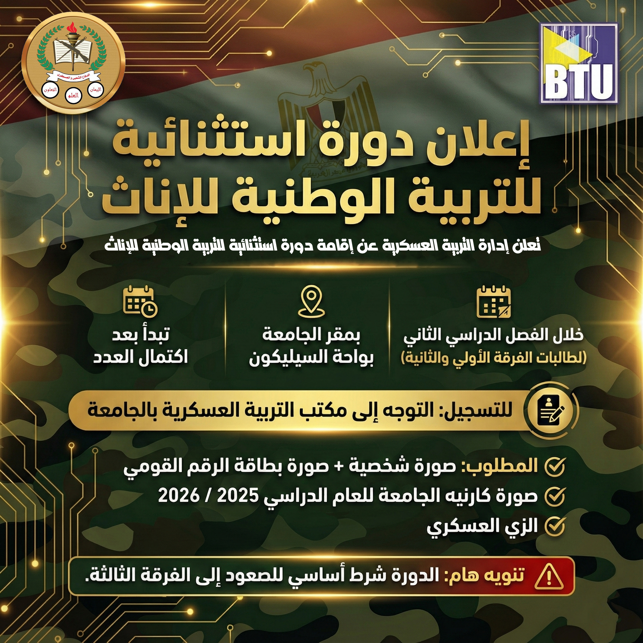 تعلن إدارة التربية العسكرية عن إقامة دورة استثنائية للتربية الوطنية للإناث خلال الفصل الدراسي الثاني، وذلك بمقر الجامعة بواحة السيليكون، على أن تبدأ الدورة بعد اكتمال العدد المطلوب، وذلك لطالبات الفرقة الأولى والثانية للتسجيل، يرجى التوجه إلى مكتب التربية العسكرية بالجامعة. المطلوب: صورة شخصية + صورة بطاقة الرقم القومي صورة كارنيه الجامعة للعام الدراسي 2025 / 2026 الزي العسكري تنويه هام: الدورة شرط أساسي للصعود إلى الفرقة الثالثة.