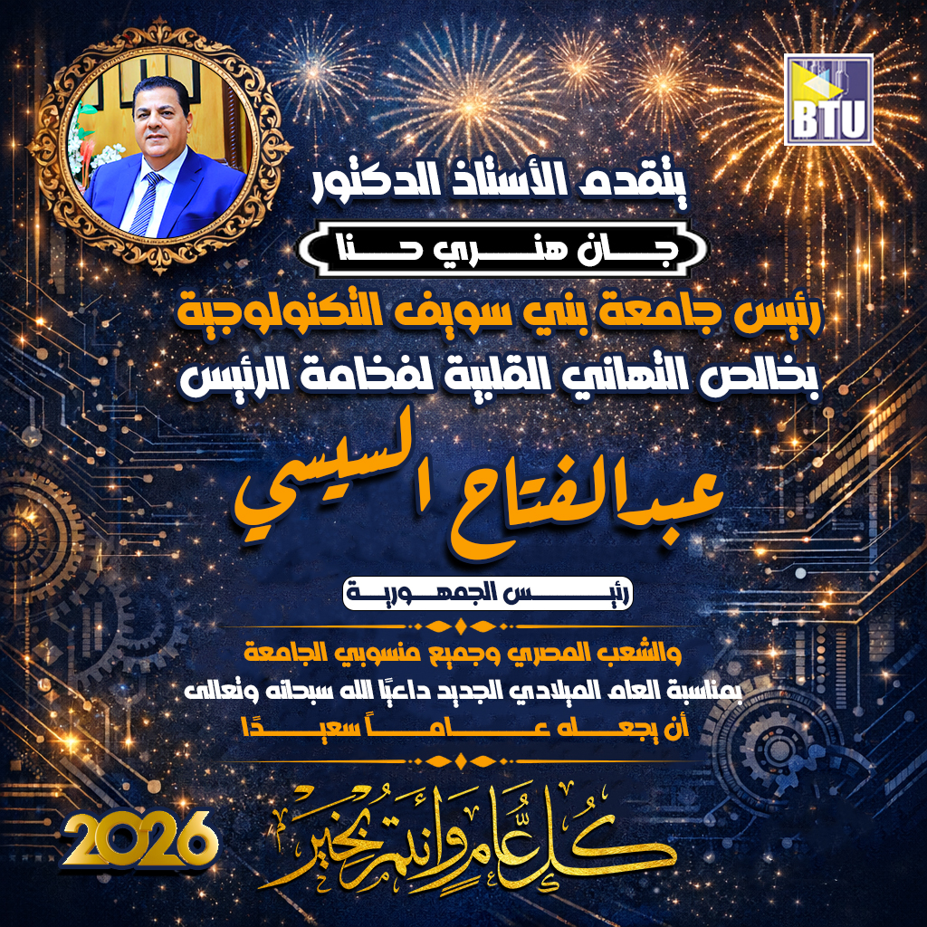 يتقدم الأستاذ الدكتور جان هنري حنا رئيس جامعة بني سويف التكنولوجية بخالص التهاني القلبية لفخامة الرئيس عبدالفتاح السيسي رئيس الجمهورية والشعب المصري وجميع منسوبي الجامعة بمناسبة العام الميلادي الجديد داعيًا الله سبحانه وتعالى أن يجعله عامًا سعيدًا وكل عام وأنتم بخير