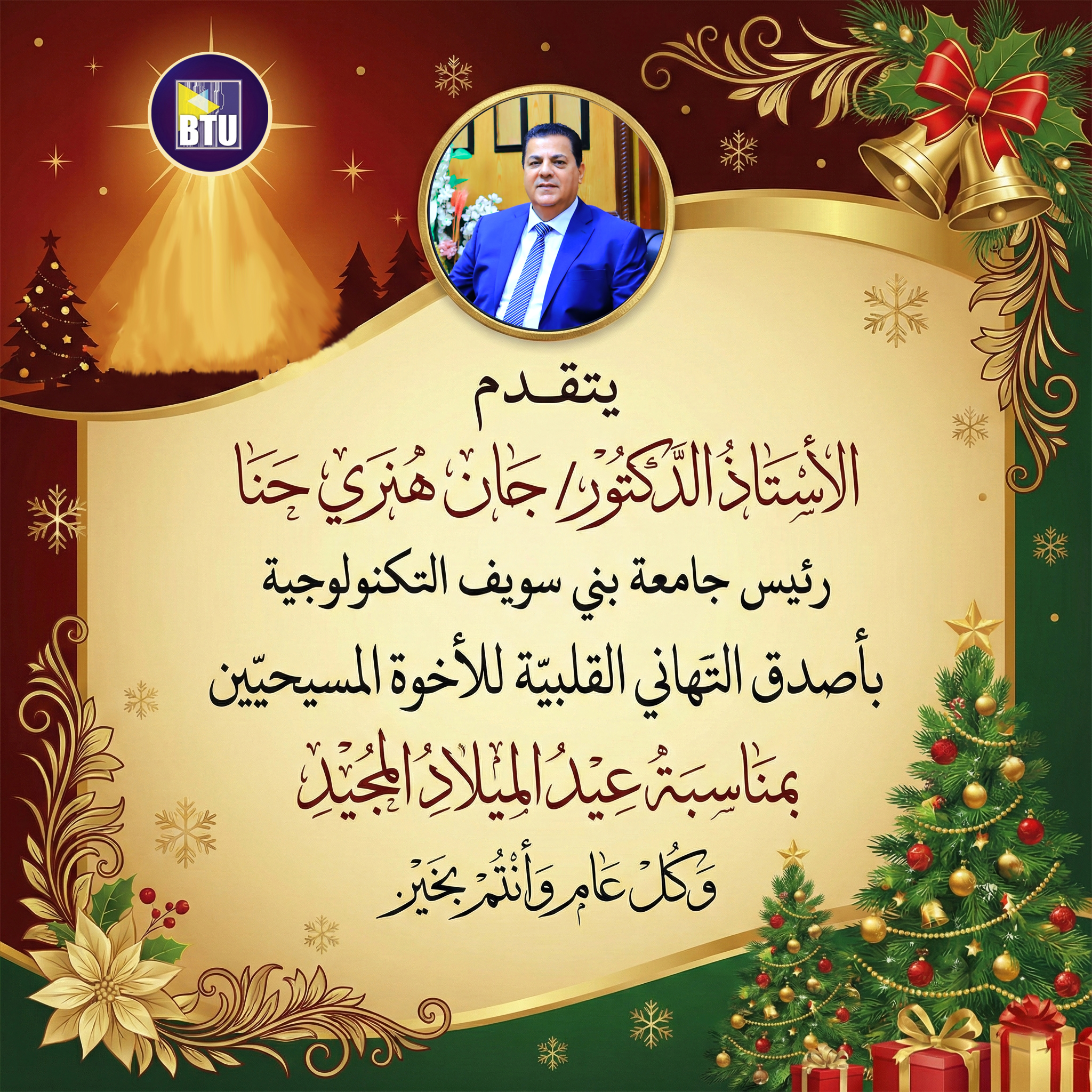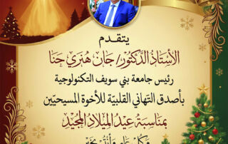 يتقدم الأستاذ الدكتور/ جان هنري حنا رئيس جامعة بني سويف التكنولوجية بأصدق التهاني القلبية للأخوة المسيحيين بمناسبة عيد الميلاد المجيد وكل عام وأنتم بخير.