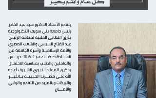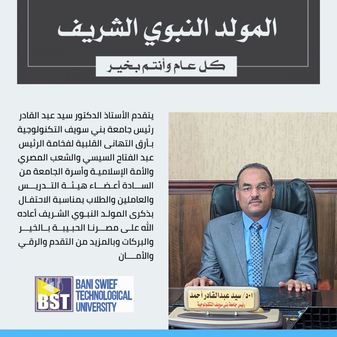 المركز الإعلامي يتقدم الأستاذ الدكتور سيد عبد القادر رئيس جامعة بني سويف التكنولوجية بأرق التهانى القلبية لفخامة الرئيس عبد الفتاح السيسي والشعب المصري والأمة الإسلامية وأسرة الجامعة من السادة أعضاء هيئة التدريس والعاملين والطلاب بمناسبة الاحتفال بذكرى المولد النبوي الشريف أعاده الله على مصرنا الحبيبة بالخير والبركات وبالمزيد من التقدم والرقي والأمان