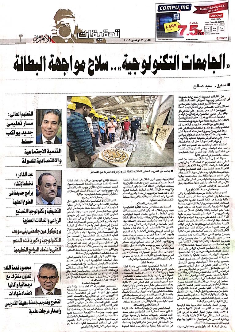 رئيس جامعة بني سويف التكنولوجية لجريدة الأهرام “نتواصل مع الجانب الهندي للتعاون في مجال الإنتاج والتصنيع الزراعي”